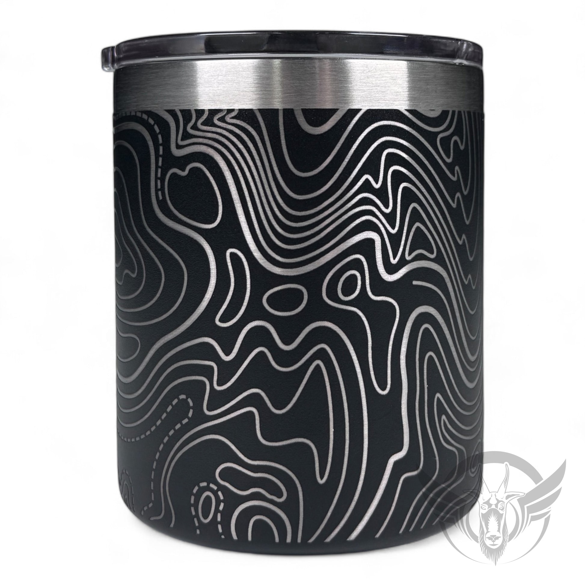 Topography graphic laser engraved on a 14 oz tumbler comes with two lids, a magnetic slide lid and standard lid. Available in multiple colors and ships within three business days.